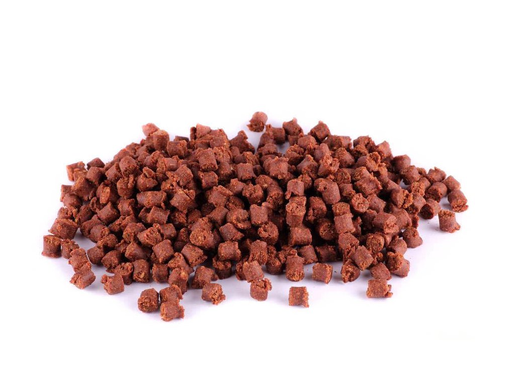 Výcvikový pamlsek vyrábíme ve tvaru drobných peletek o průměru 8 mm a délce cca 5 - 6 mm. Jde o vařený produkt z převládající několika druhů masových mouček s přídavkem mořského krillu a jen s menším, pouze pro soudržnost nutným rostlinným podílem, který neobsahuje lepek.